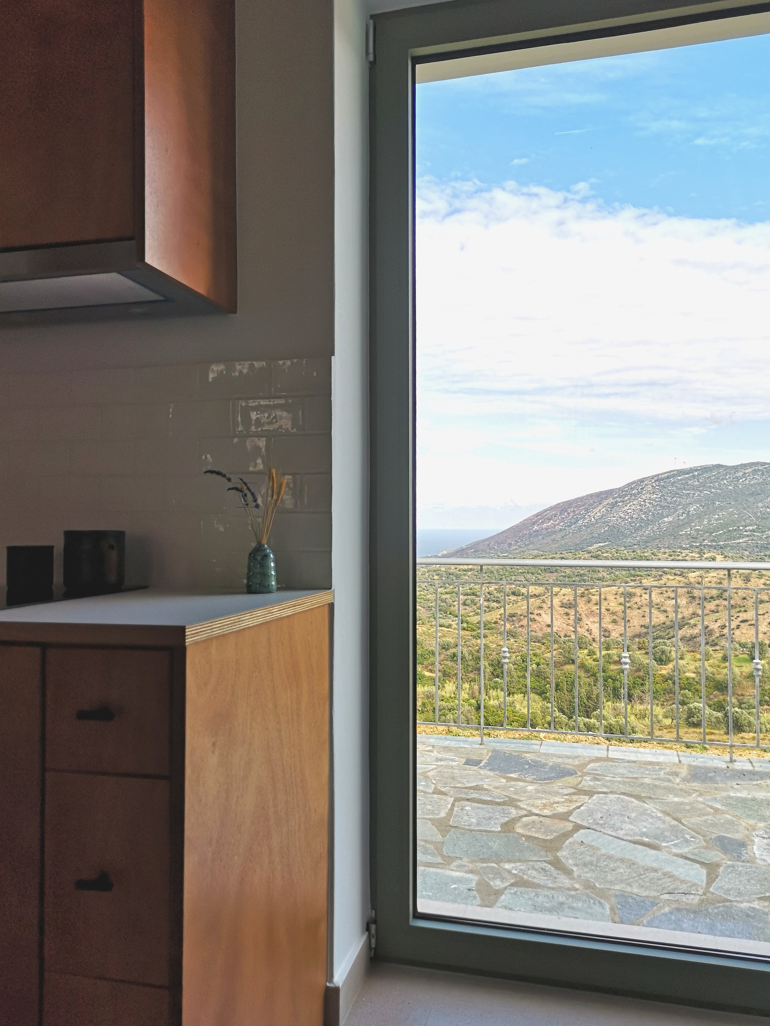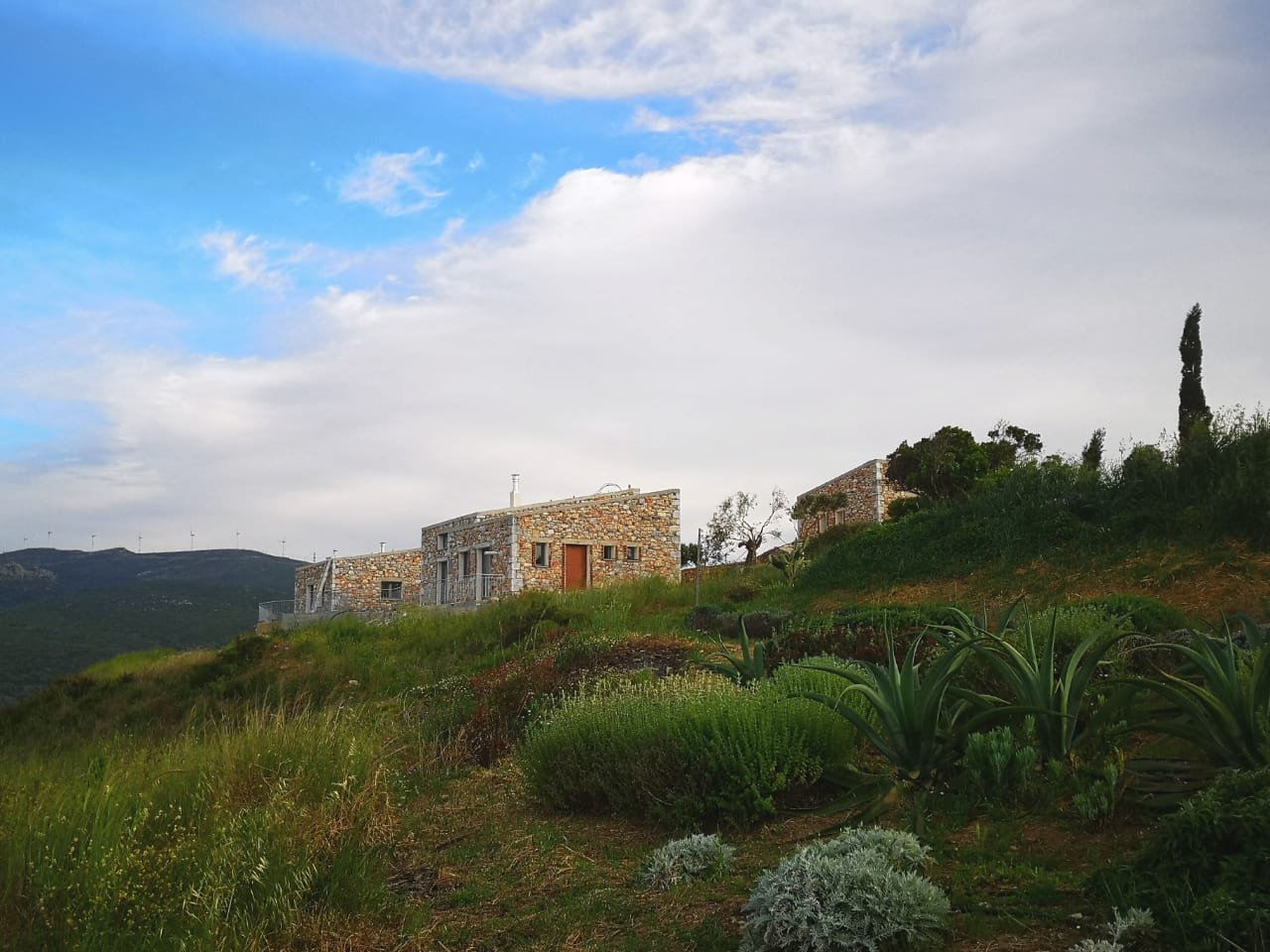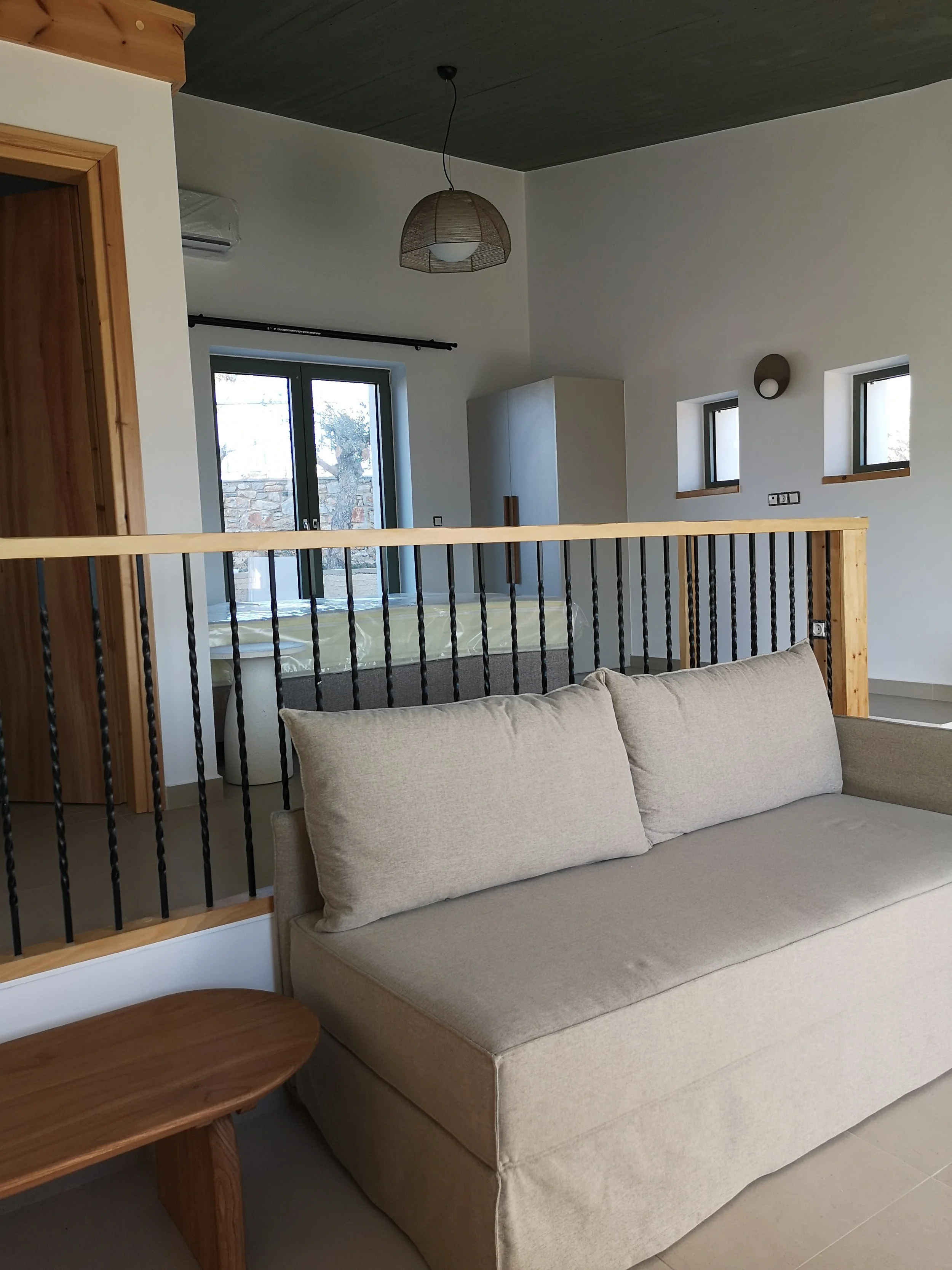 Inside, board formed concrete ceilings, wooden elements crafted by local carpenters, exposed stone accents and a warm palette give each space an airy and inviting appeal. Seamlessly integrated into our rural landscape and positioned looking towards the Aegean and a view to the sun rising from the hilltops, our houses offer abundant natural light and a spacious layout creating a relaxing and inviting environment.