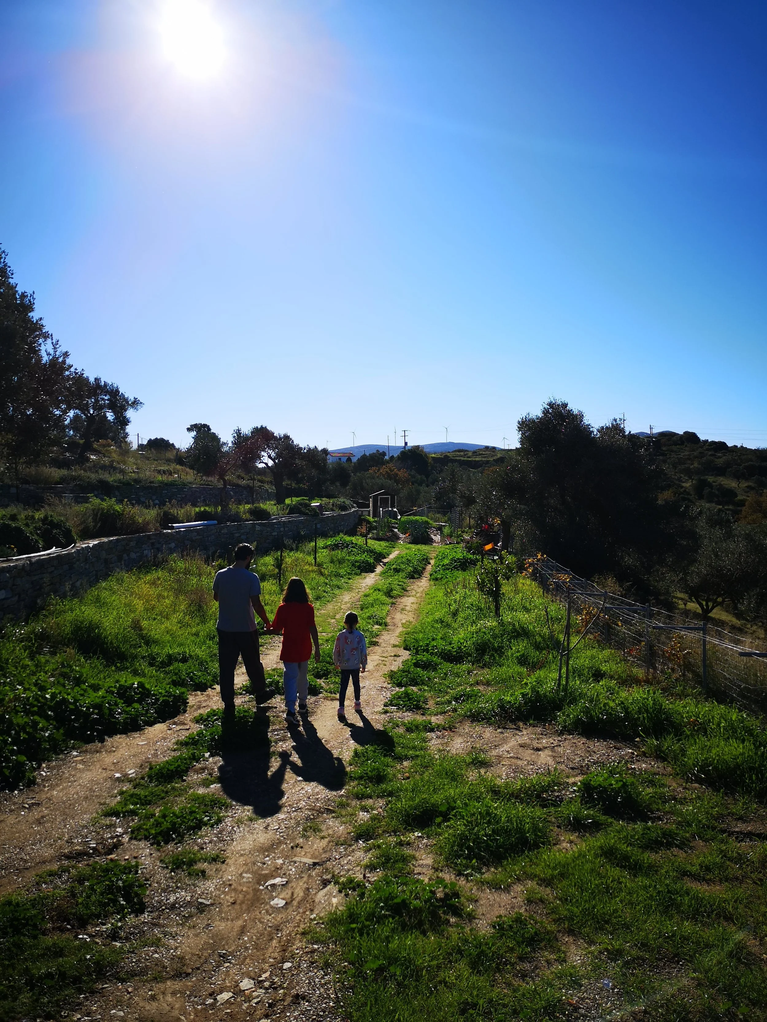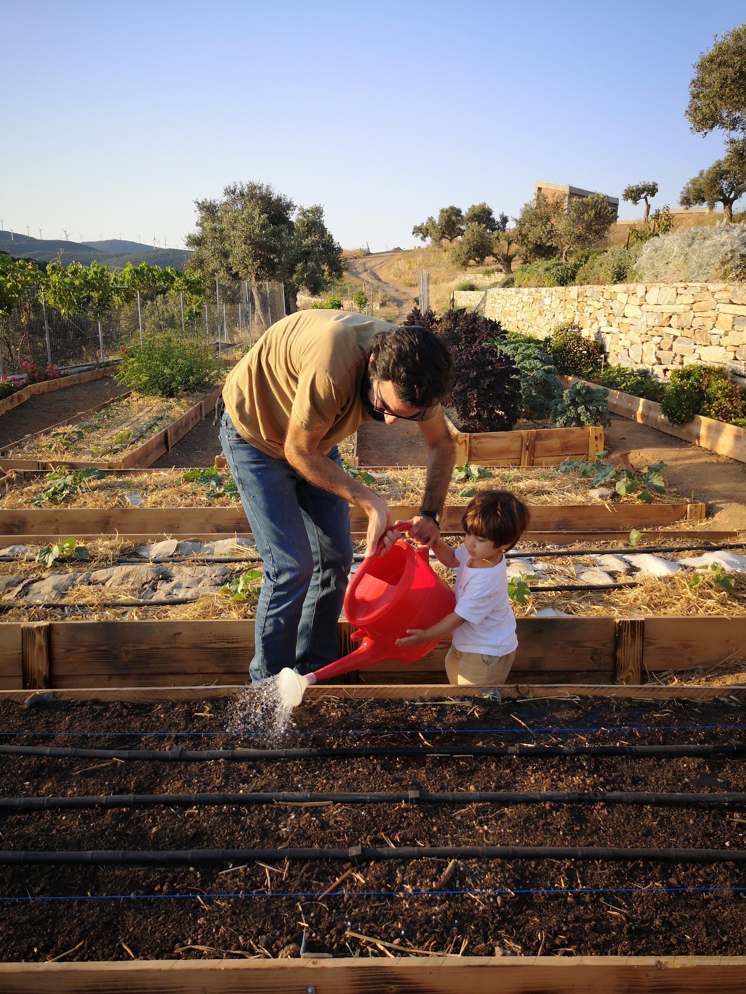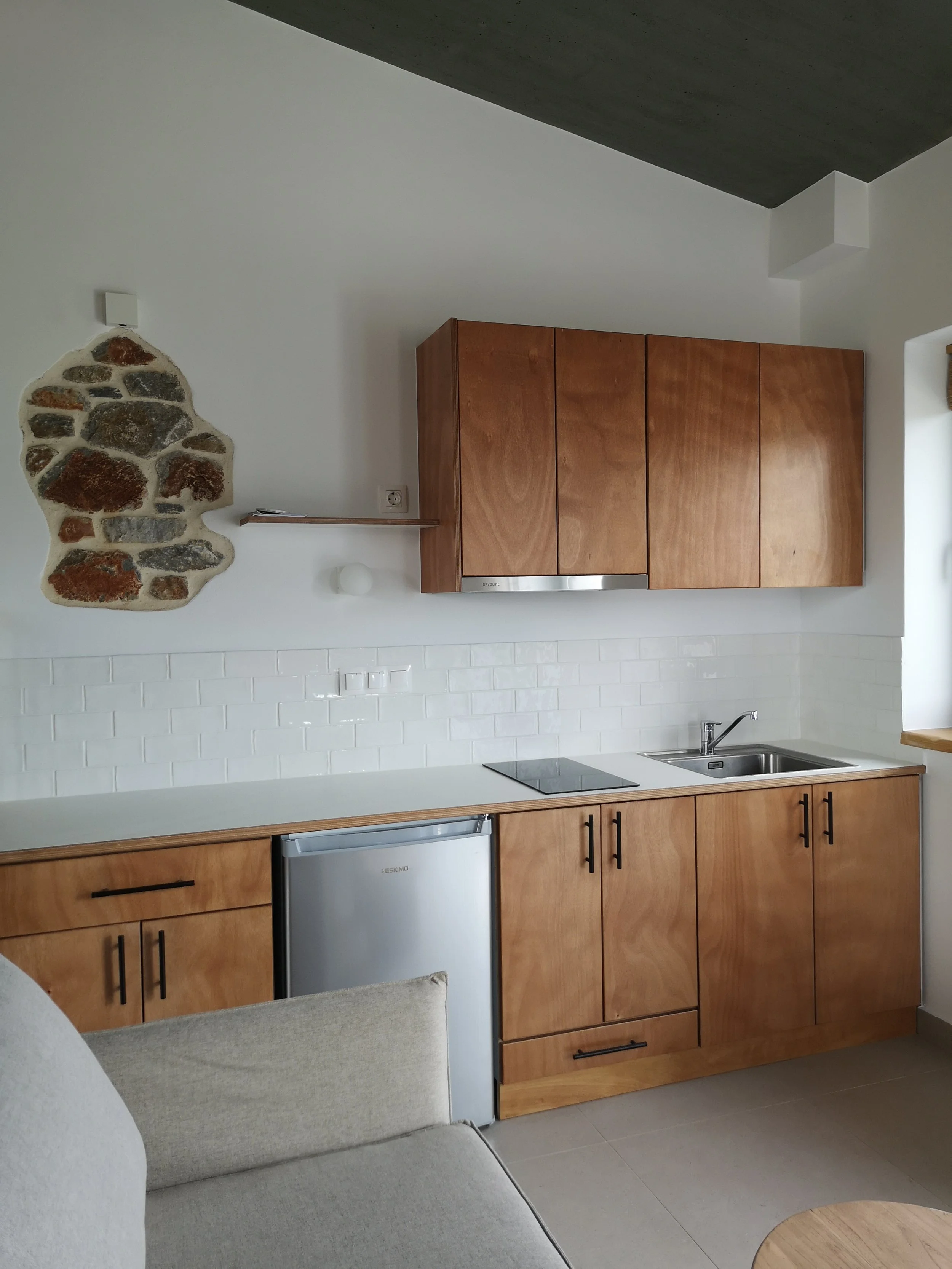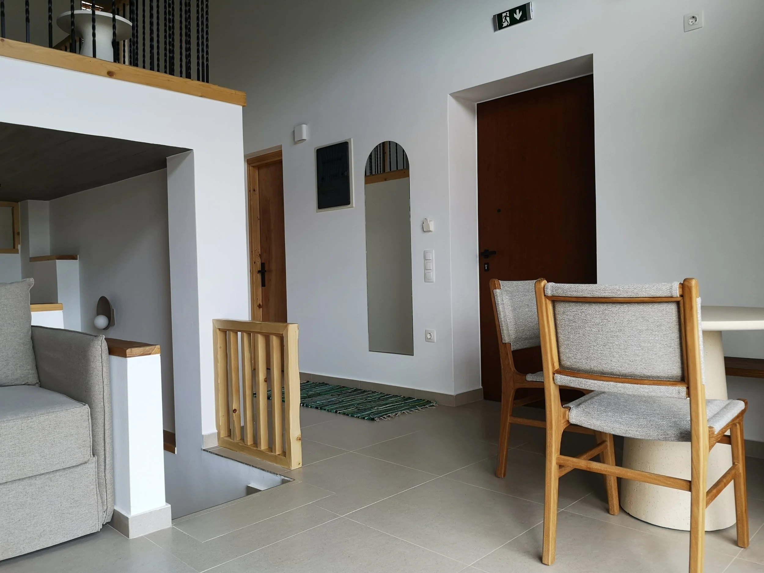 Inside, board formed concrete ceilings, wooden elements crafted by local carpenters, exposed stone accents and a warm palette give each space an airy and inviting appeal. Seamlessly integrated into our rural landscape and positioned looking towards the Aegean and a view to the sun rising from the hilltops, our houses offer abundant natural light and a spacious layout creating a relaxing and inviting environment.